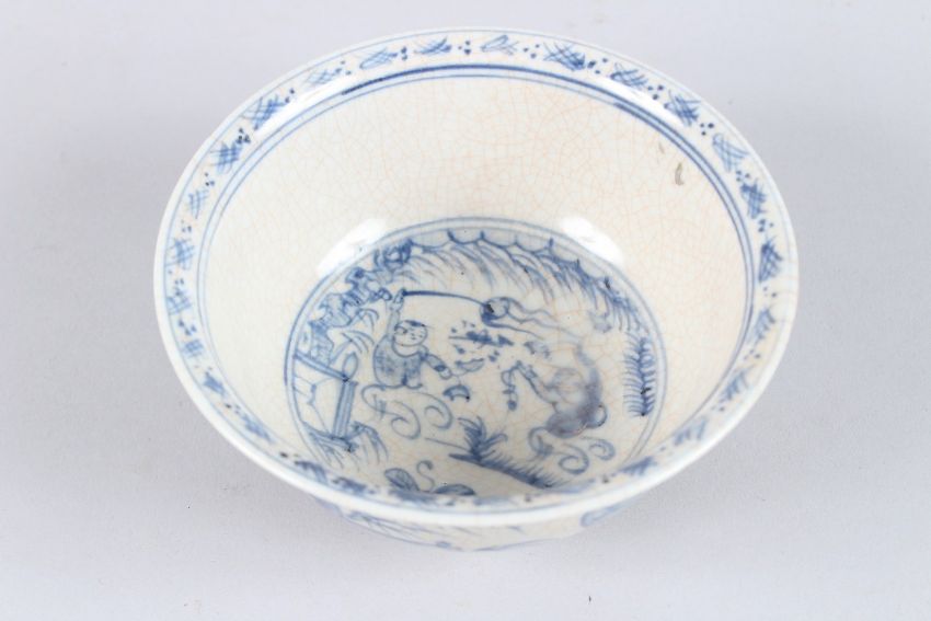 A SMALL CHINESE BLUE AND WHITE BOWL decorated with young boys.