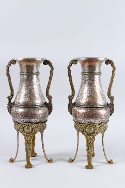A VERY FINE LARGE PAIR OF 19TH CENTURY ISLAMIC ALHAMBRA STYLE SPANISH, possibly Toledo, MIXED METAL TWIN HANDLED VASES.