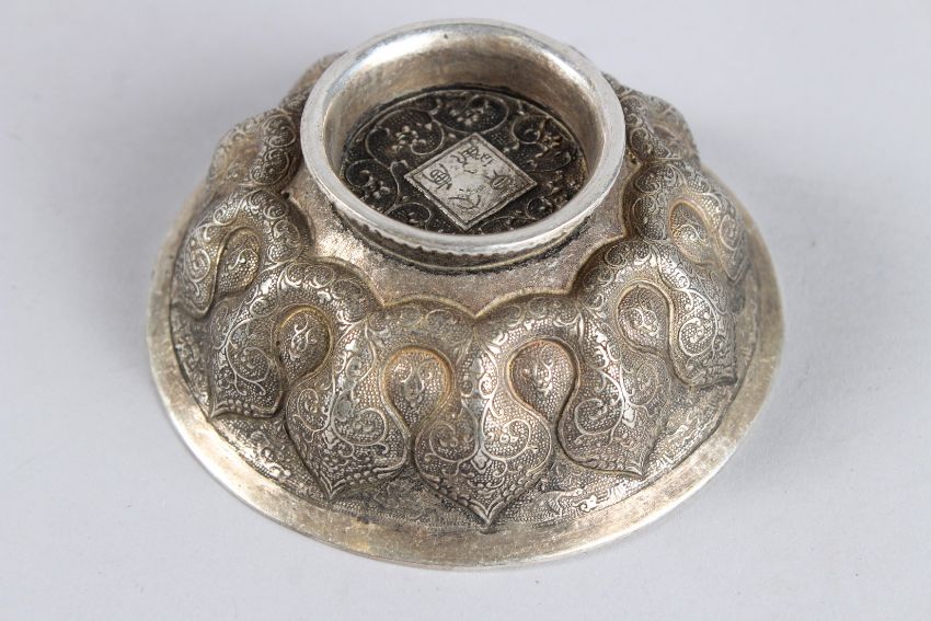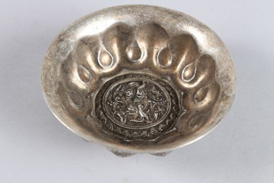 A HEAVY CHINESE WHITE METAL CIRCULAR CENSER.