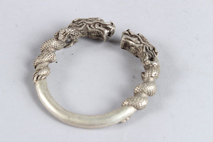 A CHINESE WHITE METAL DRAGON BANGLE.