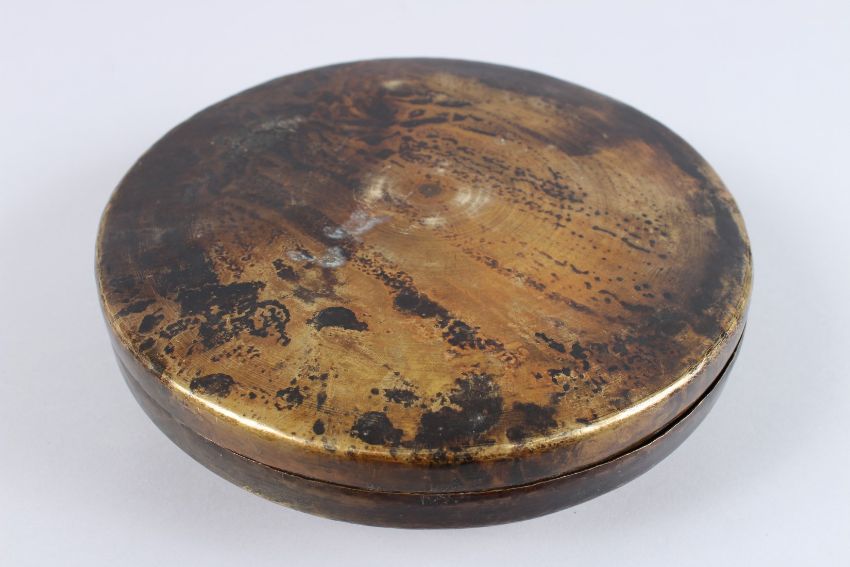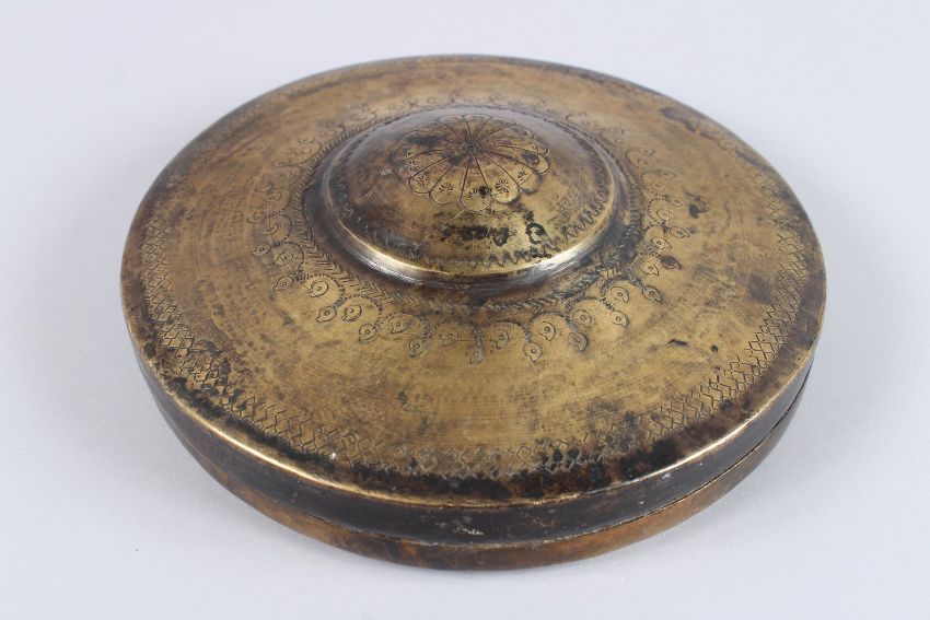 AN INDIAN BRASS LINE TRAVEL MIRROR, with mirrored panel and painted with figures.