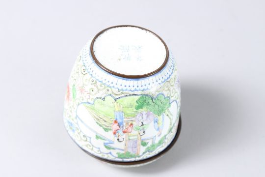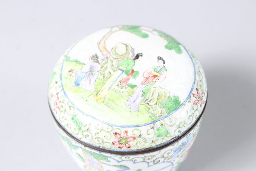 A SMALL 18TH CENTURY CHINESE ENAMEL BOX AND COVER with panels of figures. Signed.
