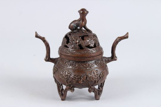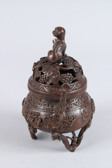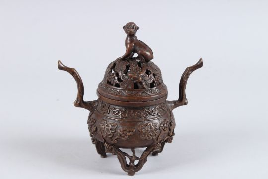 A GOOD CHINESE BRONZE CIRCULAR KORO AND COVER with monkey finial.