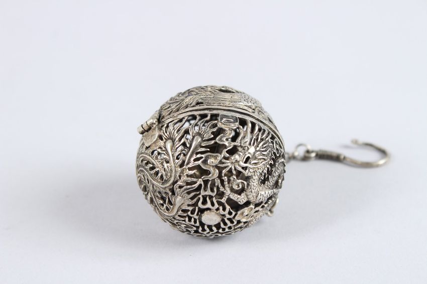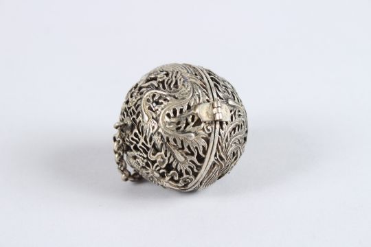A CHINESE OPEN WORK WHITE METAL CENSER BALL.