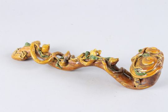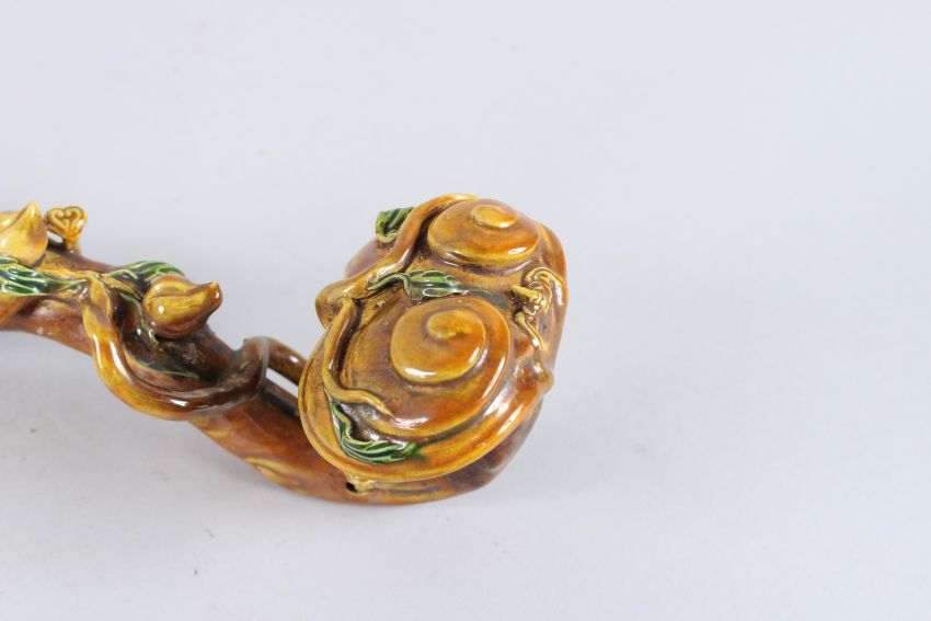 A CHINESE BROWN GLAZED PORCELAIN SCEPTRE.