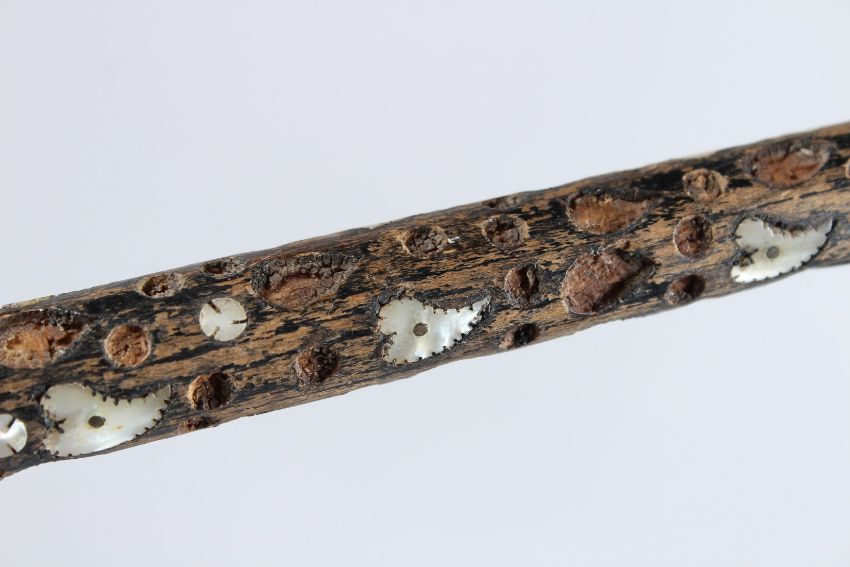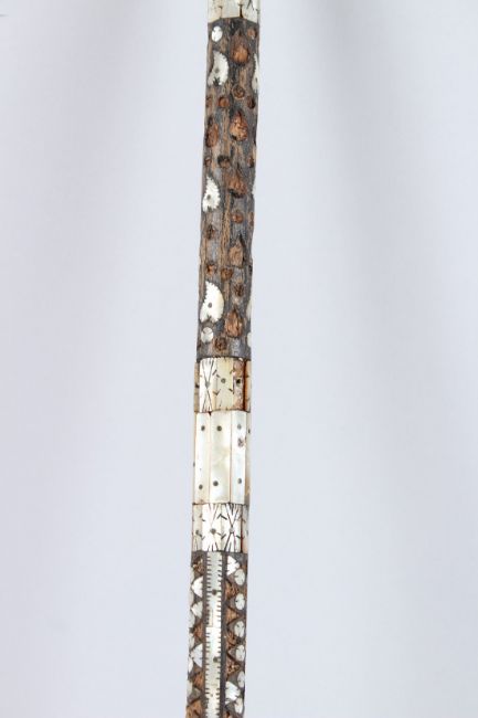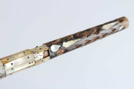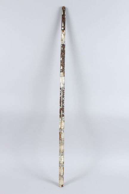 AN EARLY INDO PORTUGESE MOTHER-OF-PEARL MOUNTED WALKING STICK.