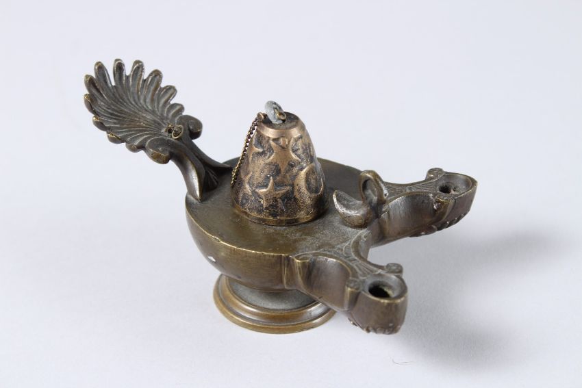 AN ANCIENT ROMAN BRONZE DOUBLE OIL LAMP with shell handle.