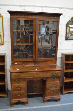A George III mahogany secretaire kneehole bookcase with pair of glazed doors and two drawers above a base with a secretaire drawer and further smaller drawers.