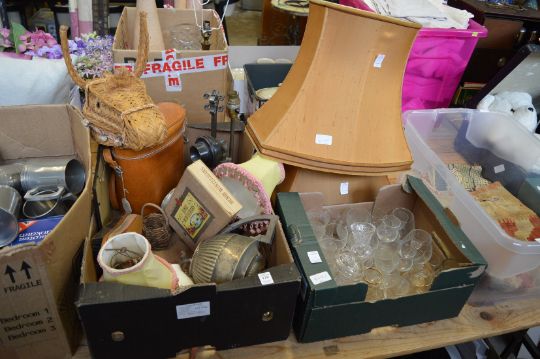 Miscellaneous collectables, glassware and a pair of lamp shades.