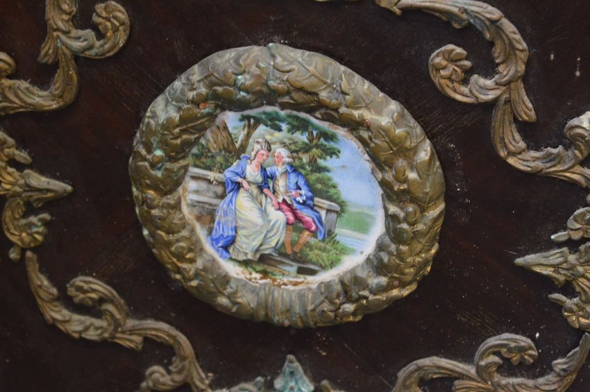 A decorative French style marble top side cabinet with ormolu mounts and enamelled column supports.