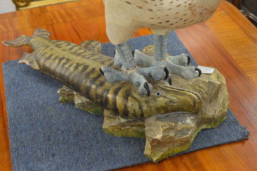 A large painted carved wood model of an Eagle with fish (faults).