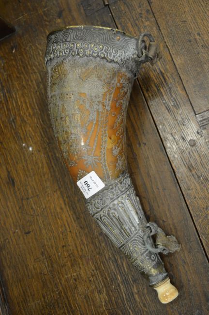 A very good horn powder flask with decorative brass mounts, the horn with engraved decoration.