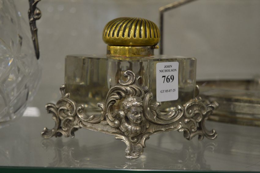 Cut glass inkwell with brass hinged top and ornate cast metal stand.