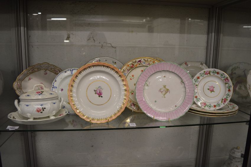 A small Derby floral decorated tureen cover and stand together with other 19th century and later Derby and other cabinet plates.