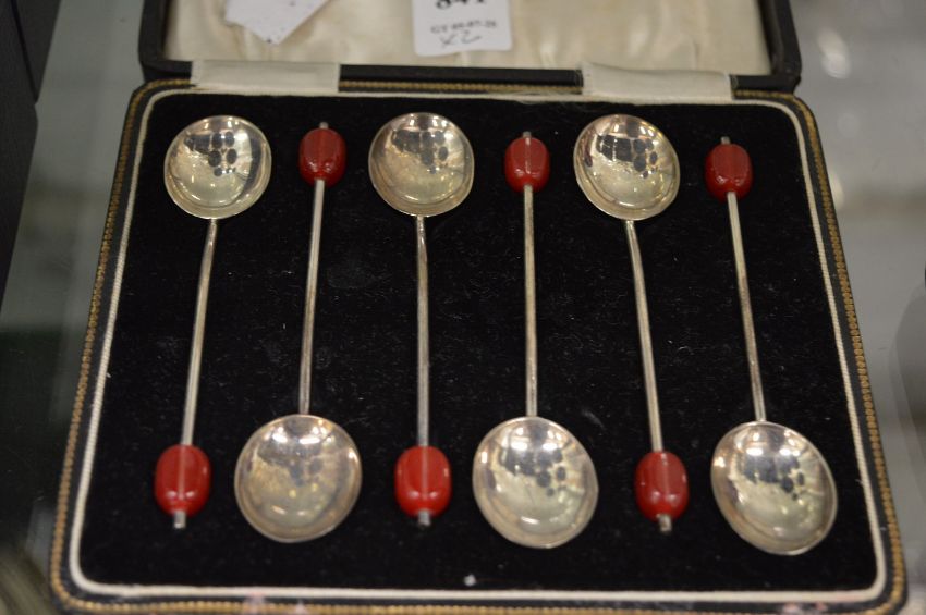 A cased set of six silver coffee bean spoons, Birmingham 1935 together with a cased silver dessert spoon, London 1904.