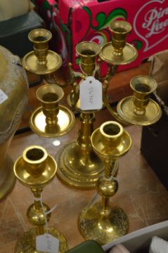 An Eastern brass jar and cover, candelabra and a pair of candlesticks.