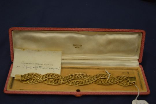 An 18ct gold interwoven mesh bracelet, housed in a Bulgari box.