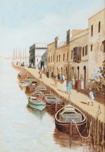 Street scene with mosque and another of a harbour side,