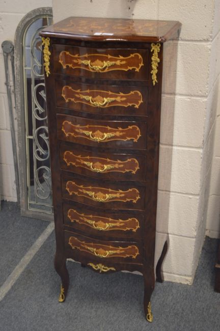 A FRENCH STYLE MARQUETRY AND ORMOLU MOUNTED SEMAINIER.