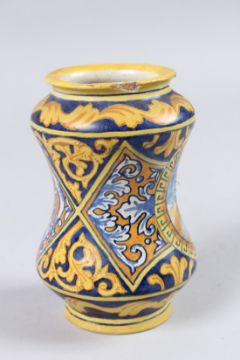 A SMALL ITALIAN MAIOLICA DRUG JAR, of waisted form, painted panel depicting the bust of a Centurion, 5in high.