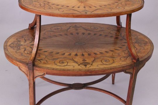 EDWARDS & ROBERTS, A VERY GOOD SATINWOOD AND MARQUETRY OVAL TWO-TIER ETAGERE, both tiers inlaid with radiating paterae, hare bells, classical urns, ribbons and bows and floral swags, supported on bracketed slender curving legs united by an X shaped stretcher. Applied paper label to the underside, EDWARDS & ROBERTS, Upholstery Warehouse, Wardour Street, London, 2ft 7in high x 2ft 11in long x 1ft 10in wide.