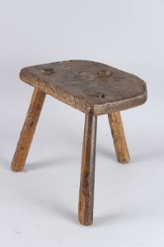 A RUSTIC THREE LEGGED STOOL.