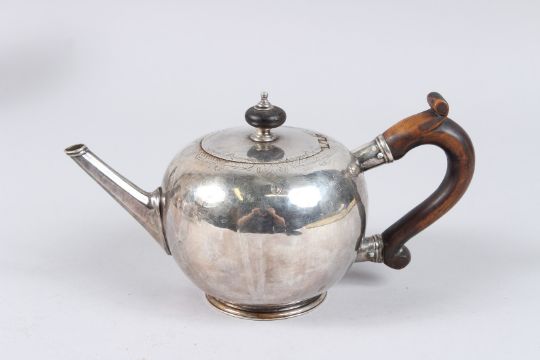 A GEORGE II SILVER BULLET SHAPE TEAPOT, engraved with a hereldic crest, London 1731, maker WD.