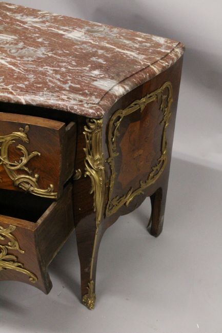 A VERY GOOD LOUIS XVI KINGWOOD AND MARQUETRY BOMBE COMMODE with marble top, two deep drawers with ormolu mounts.