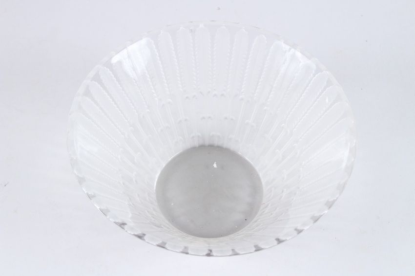 A LALIQUE FEATHER GLASS CIRCULAR BOWL.