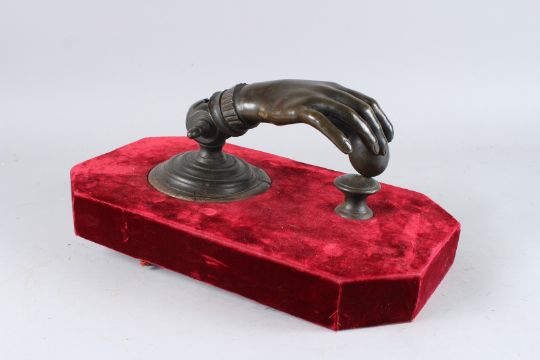 A SUPERB LARGE BRONZE HAND DOOR KNOCKER.