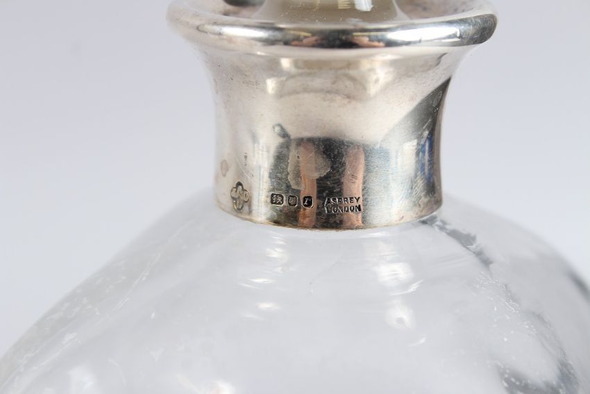 AN ASPREY GLASS DECANTER AND STOPPER with silver rim.