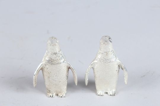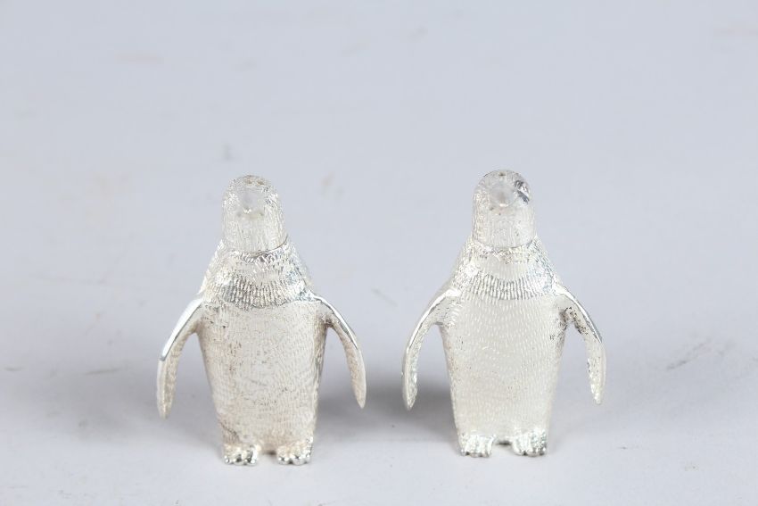 A SMALL PAIR OF SILVER PLATE PENGUIN SALT AND PEPPERS.