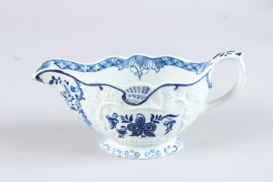A BOW BLUE AND WHITE MOULDED FLORAL PATTERN SAUCEBOAT with shell motifs. Circa 1758 - 1762.