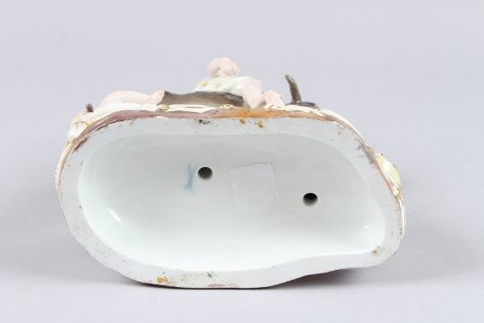 A GOOD MEISSEN PORCELAIN GROUP, modelled as a donkey being ridden by a male Bacchanalian figure, another by its side, a seated woman feeding it grapes from a basket and a cherub pulling its tail, 8.5in high.