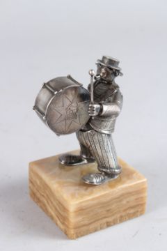 A SMALL SILVER FIGURE OF A MAN playing drums, on a marble base.