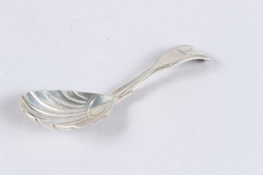 A SILVER FIDDLE AND THREAD PATTERN CADDY SPOON, with shell shape bowl, London 1861, maker GA, 4¼in long.