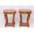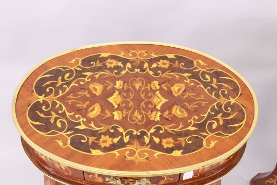 A PAIR OF FRENCH STYLE MAHOGANY AND MARQUETRY OVAL TWO-TIER SINGLE DRAWER OCCASIONAL TABLES, with brass mounts on carving legs, 2ft 4in high x 1ft 10in wide x 1ft 3.5in diameter.