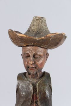 AN EARLY CARVED WOOD FOLK ART FIGURE of a seated man.