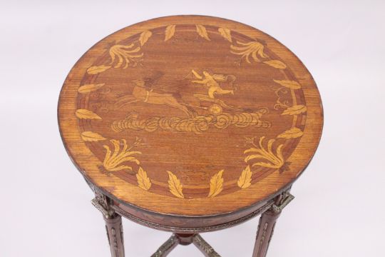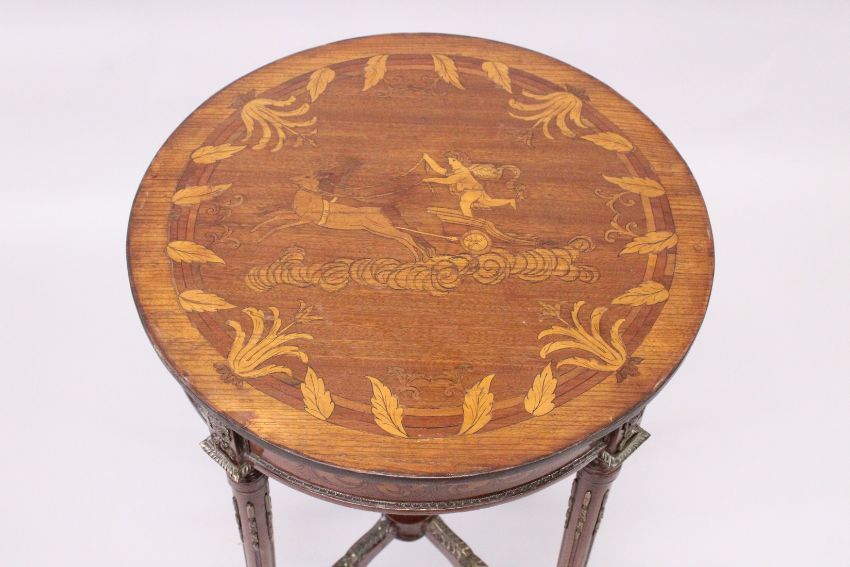 A FRENCH STYLE MAHOGANY AND ORMOLU CIRCULAR OCCASIONAL TABLE inlaid with a deer pulling a chariot.