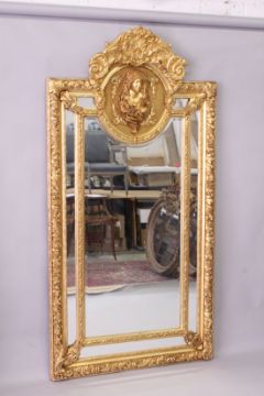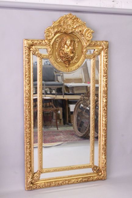 A LARGE DECORATIVE GILT FRAMED SECTIONAL MIRROR, with an oval panel depicting a bust of a young lady, 6ft 10in high x 3ft 6in wide.