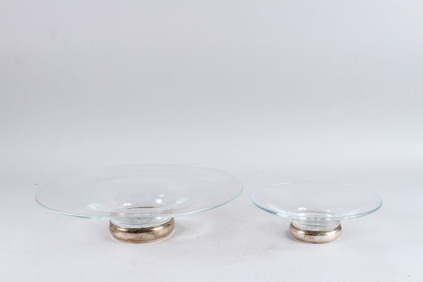 TWO GOOD GLASS CIRCULAR DISHES, 35cm wide and another smaller, 20cm wide, both with silver bases.