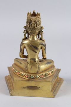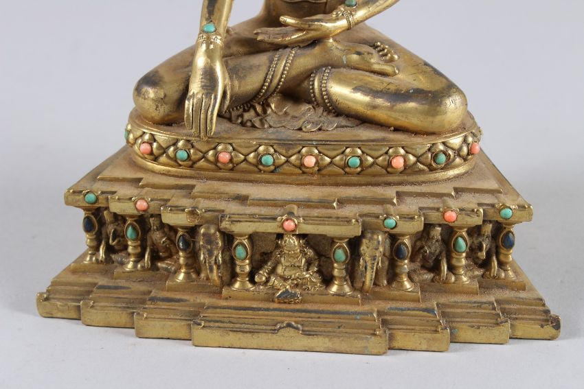 A GOOD CHINESE GILT BRONZE FIGURE, seated cross-legged and set with coral and turquoise beads.