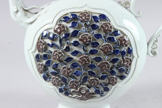A CHINESE UNDERGLAZE RED AND BLUE DECORATED PORCELAIN EWER AND COVER, with phoenix spout, 10½ high.
