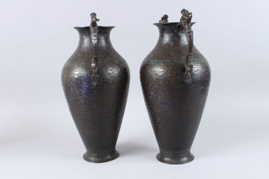 A FINE LARGE PAIR OF 19TH CENTURY INDIAN KASHMIRI ENAMELLED COPPER TWIN HANDLED VASES with calligraphy around the neck.