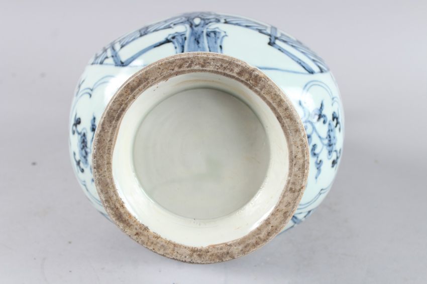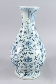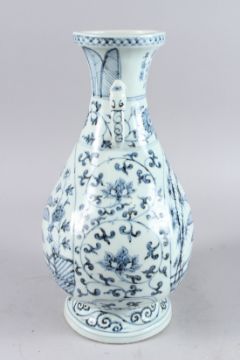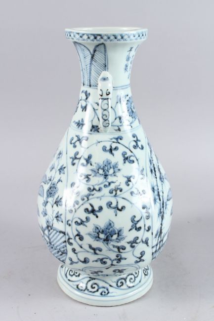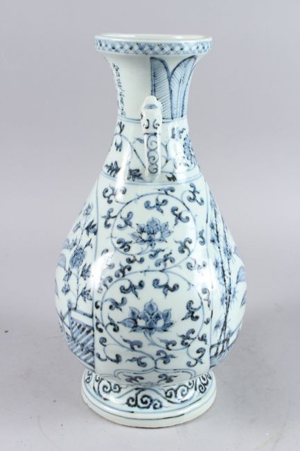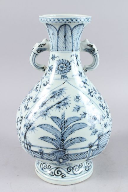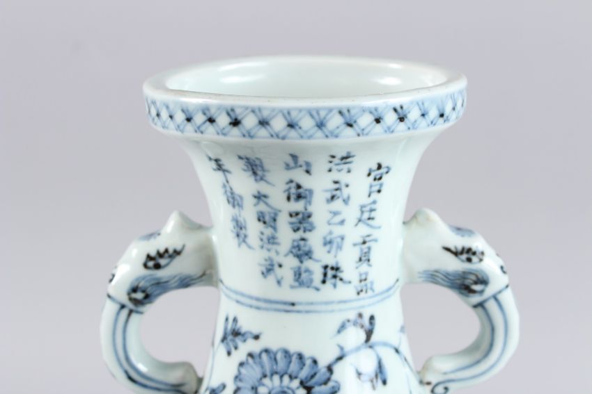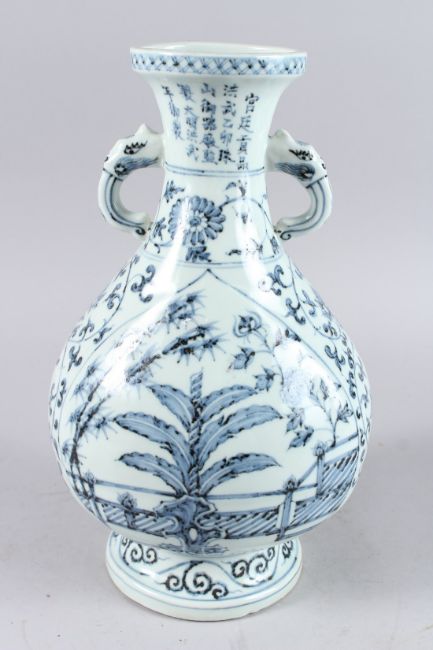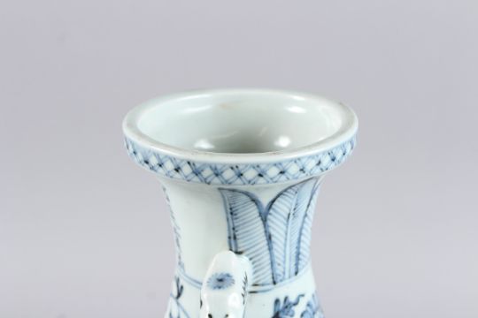 A LARGE CHINESE BLUE AND WHITE VASE, with elephant head handles, tree and fence decoration to the body, 13½in high.