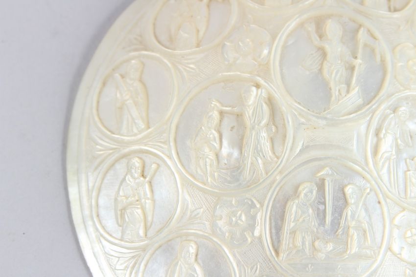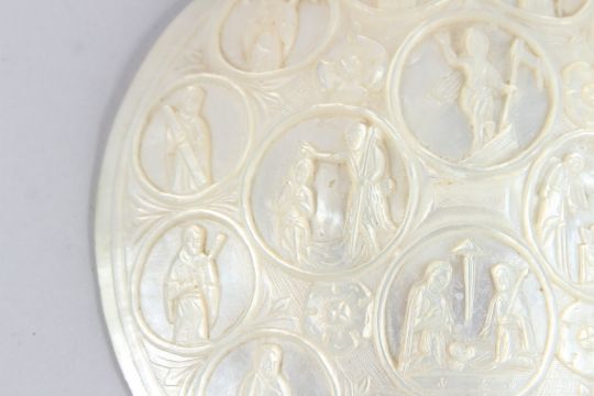 A FINELY CARVED EARLY 19TH CENTURY PALESTINIAN JERUSALEM MOTHER-OF-PEARL SHELL depicting religious figures.