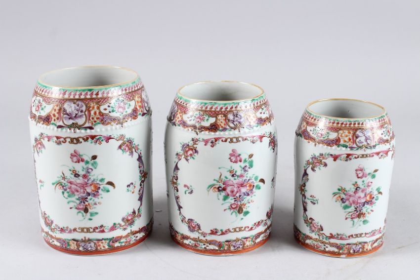 A GOOD GRADUATED SET OF THREE 19TH CENTURY CHINESE EXPORT PORCELAIN TANKARDS, with strap work handles and floral decoration to the bodies, tallest 6½in high.