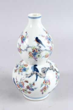 A CHINESE WUCAI DOUBLE GOURD VASE, painted with birds on a tree and butterflies, 9in high.