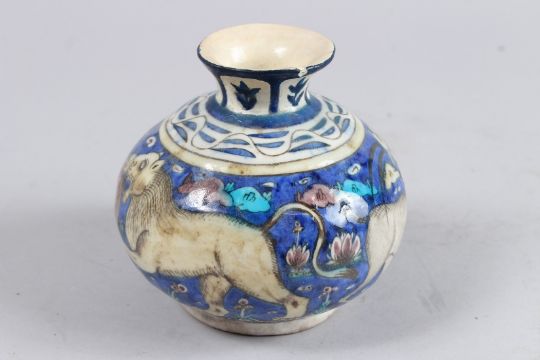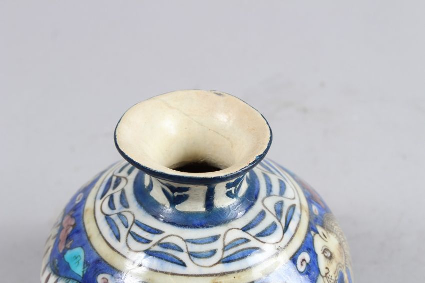 A FINE 19TH CENTURY PERSIAN QAJAR GLAZED POTTERY SQUATTED VASE.