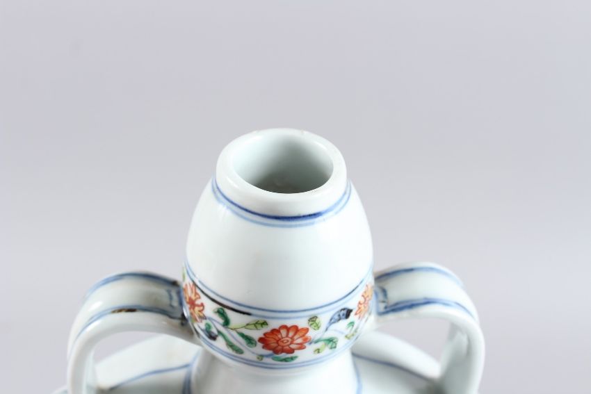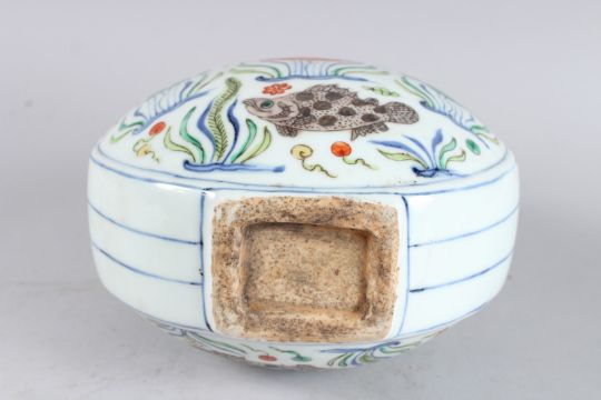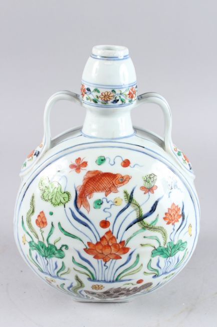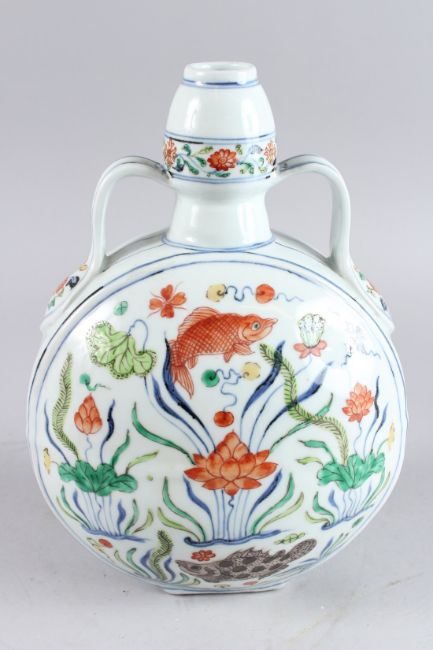 A CHINESE WUCAI TWIN HANDLED MOON FLASK, painted with fish, 11½in high.